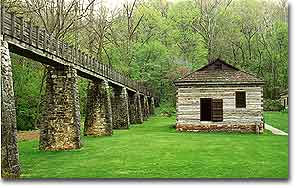 Behind the Grist Mill, this trough carries water to power the wheel. Spring Mill State Park is another reason to love Southern Indiana. Whether its learning about Indianas pioneer past, or taking in natures wonders that draws you to Spring Mill, youll be glad you visited. For information on Lawrence County see www.limestonecountry.com or call 800-798-0769. For information on Spring Mill State Park, call 812-849-4129 or see Historian Dave Williams web site on Spring Mill see www.geocities.com/BourbonStreet/Quarter/1848/ |